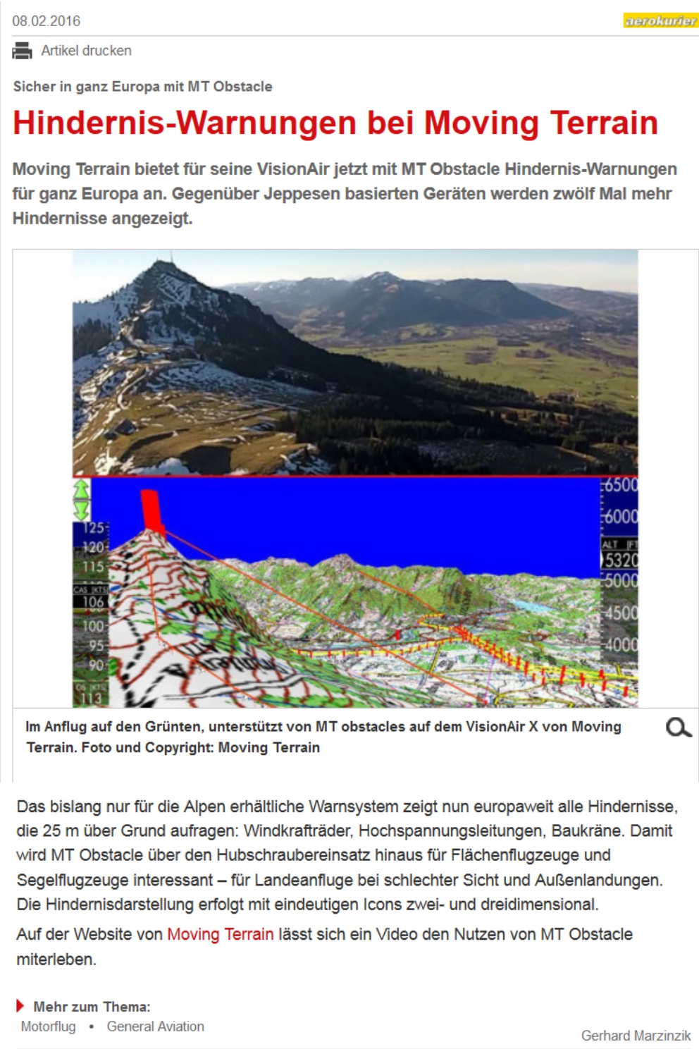 Moving Terrain bietet für seine VisionAir jetzt MT Obstacle Hindernis-Warnungen für ganz Europa an. Gegenüber Jeppesen basierten Geräten werden zwölf Mal mehr Hindernisse angezeigt.